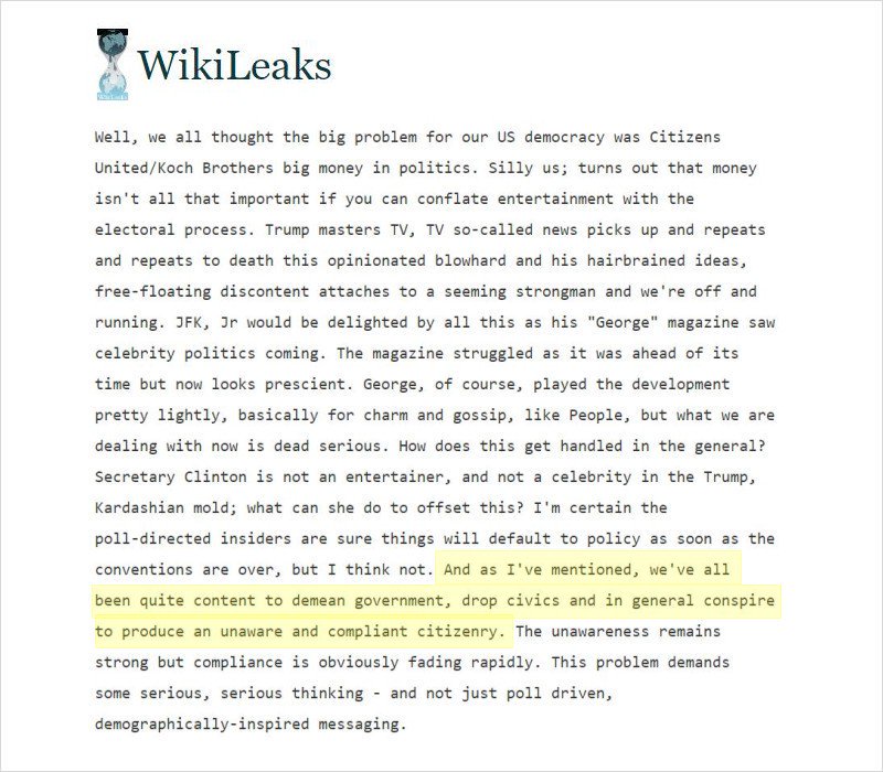 // Leaked E-Mail, Hillary Clinton insiders "Content to conspire to produce an unaware & compliant citizenry"// These people aren't even human //
