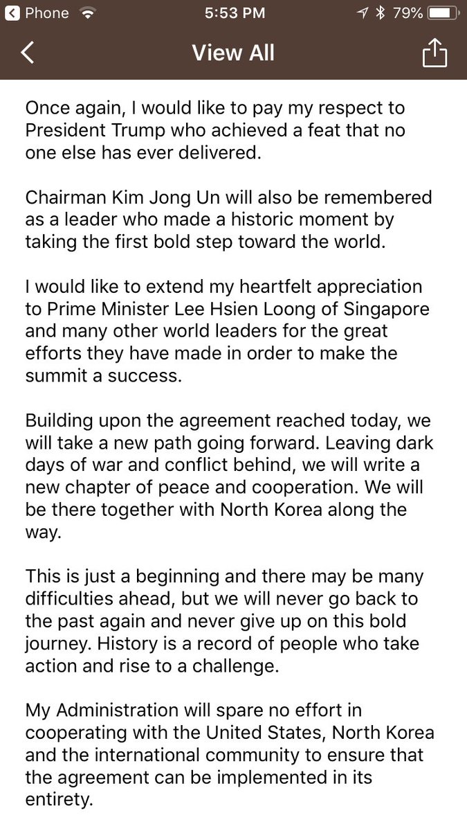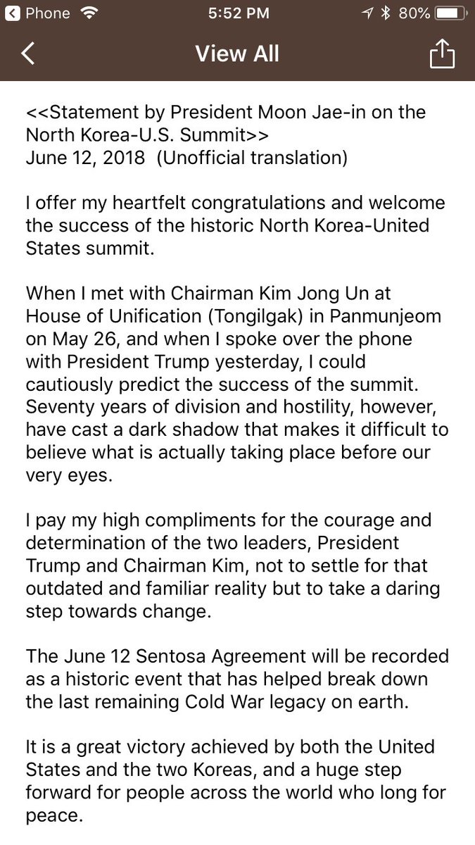 - South Korea's president and prime minister together watched a live stream of the summit opening. You can see their reaction on their faces #TrumpKimSummit
